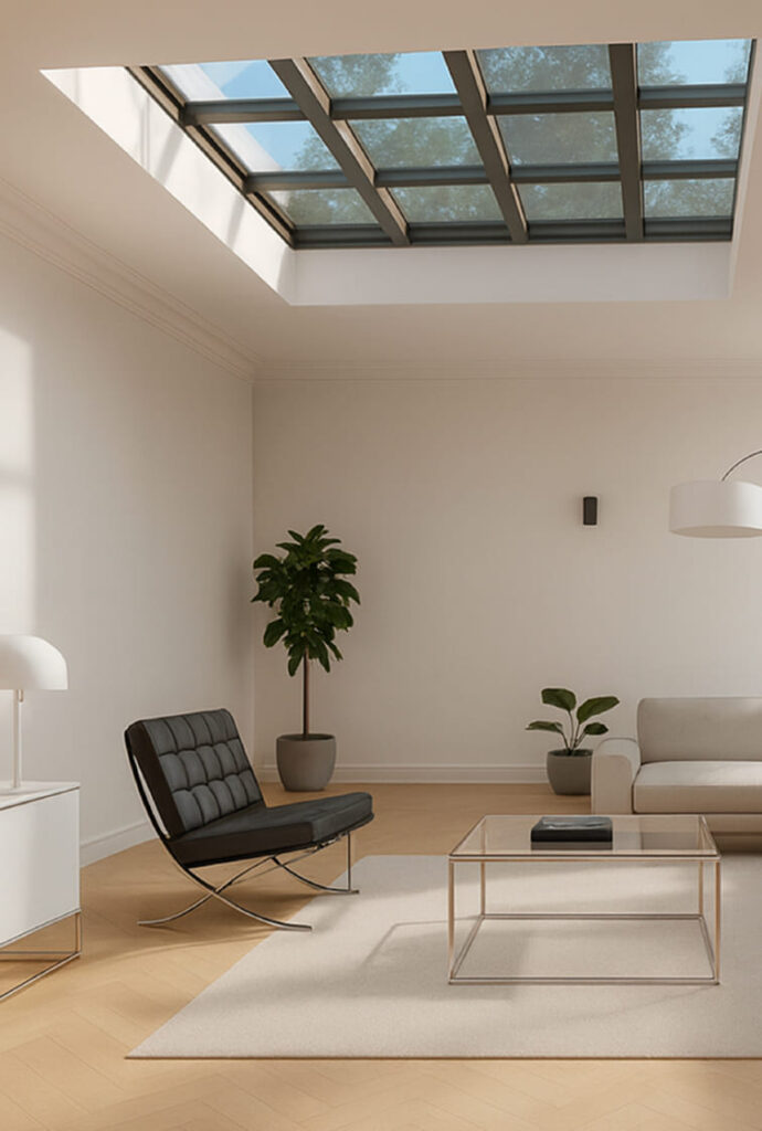 Großzügige Glasfassaden schaffen fließende Übergänge zwischen Innenraum und 130 M² Dachterrasse.